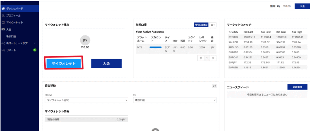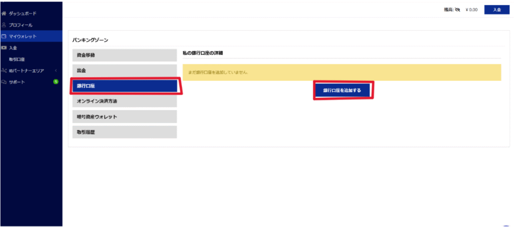 1.クライアントポータルから「マイウォレット」→「銀行口座」→「銀行口座を登録する」を選択ください。