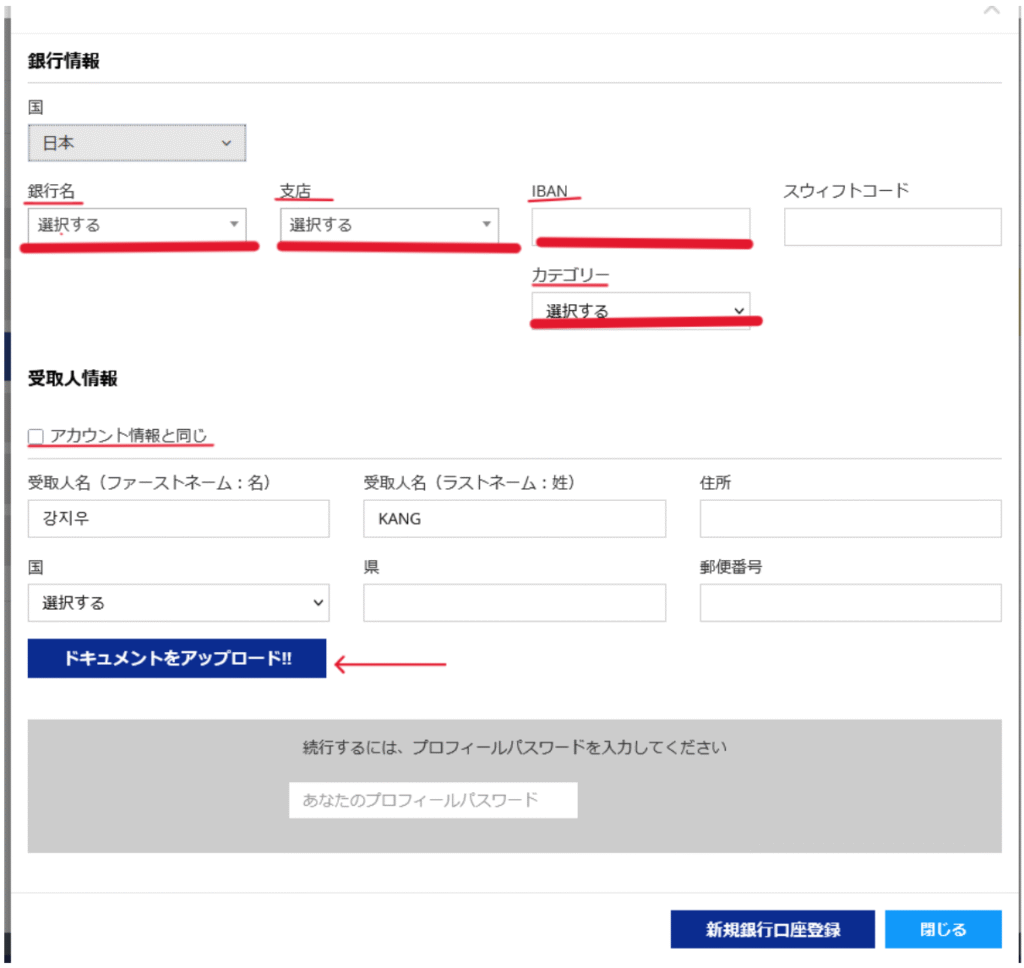 2.銀行口座情報登録画面が表示されますので、下記必須項目をご入力ください。