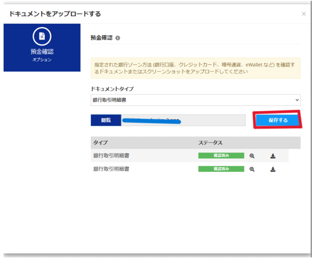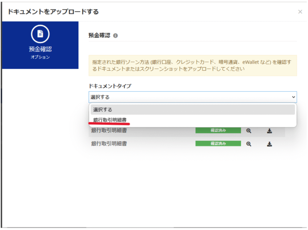 3.「ドキュメントをアップロード」という部分をクリックしますと、銀行口座証明の画像を登録する画面が表示されますので、以下の情報が明確に確認できる書類の画像を送付ください: